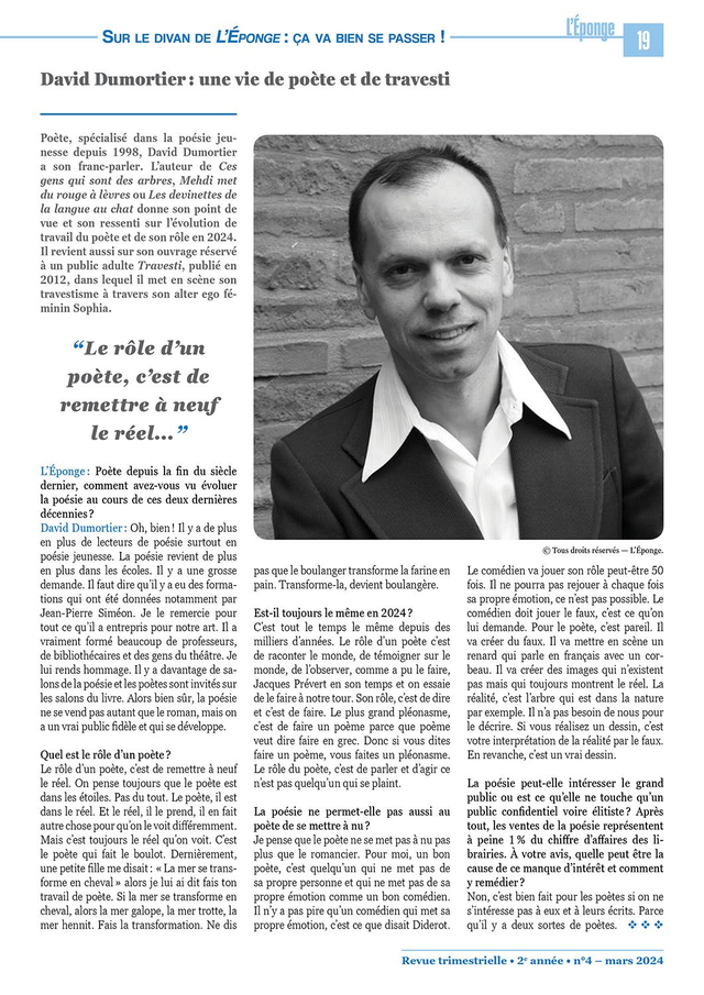 Sur le divan de L’Éponge : ça va bien se passer ! : Entretien avec David Dumortier : une vie de poète et de travesti (p.19)