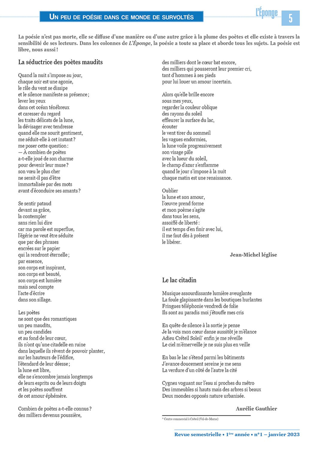 L’Éponge fondée par Aurélie Gauthier et Jean-Michel Léglise tend à valoriser la littérature, la philosophie, le graphisme, la photographie et la bonne humeur. Revue semestrielle de 24 pages.